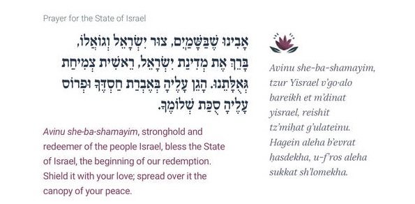 “Heavenly Father, Rock and Redeemer of Israel, bless the State of Israel, the first flourishing of our redemption, guard it in your abundant kindness, spread over it the shelter of Your peace. Send forth your light and truth to its leaders, ministers, and advisors, and grace them with Your good counsel. Strengthen the hands of those who guard our holy land, grant them deliverance, and adorn them in victory. Give peace in the land, and grant its inhabitants eternal happiness.”