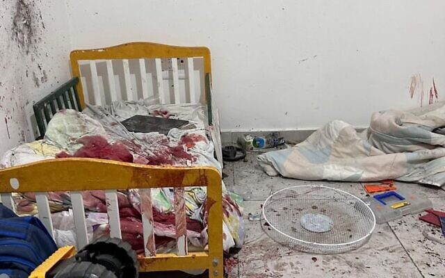 blood-soaked child’s bed in Kibbutz Kfar Aza seen in a photo shared by Prime Minister Benjamin Netanyahu on Oct. 11, 2023 in the aftermath of the Hamas assault on Israel on Oct. 7.